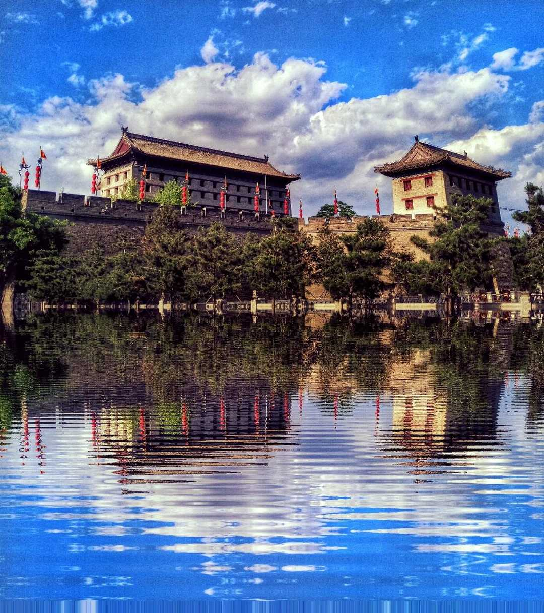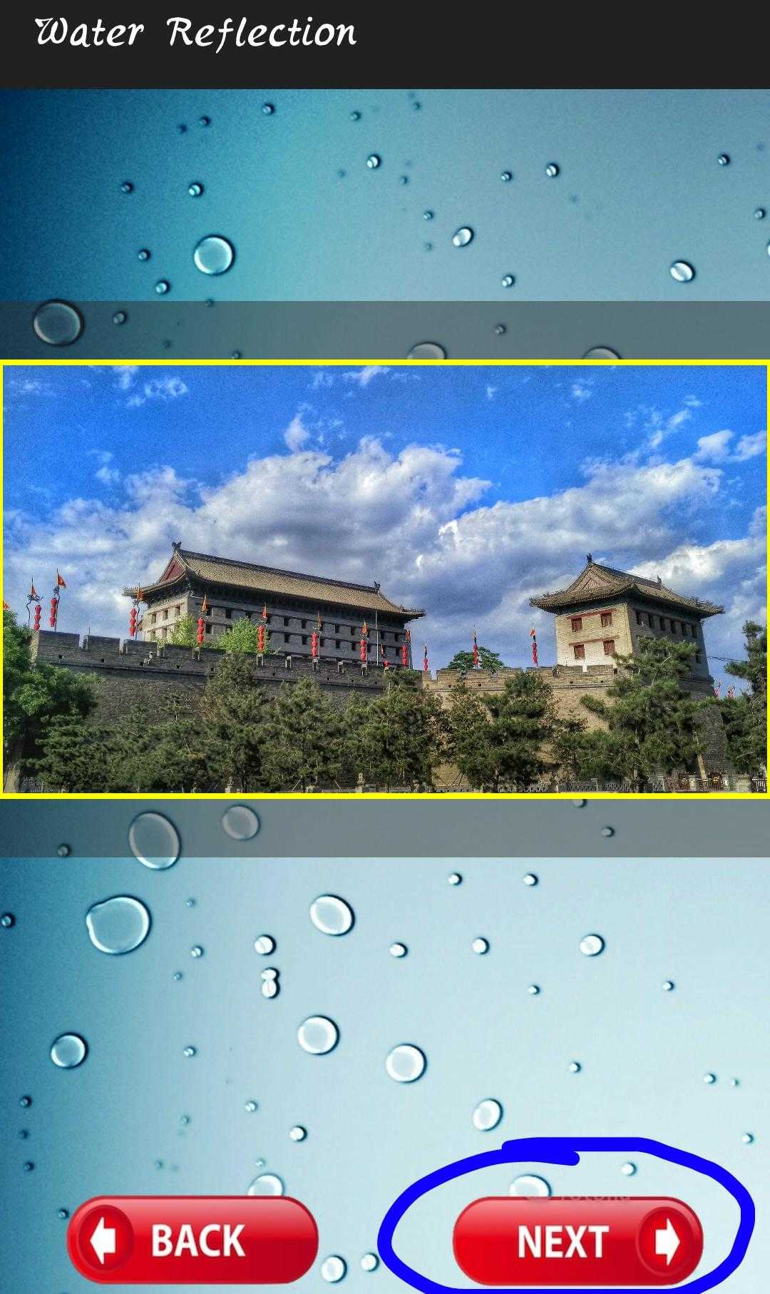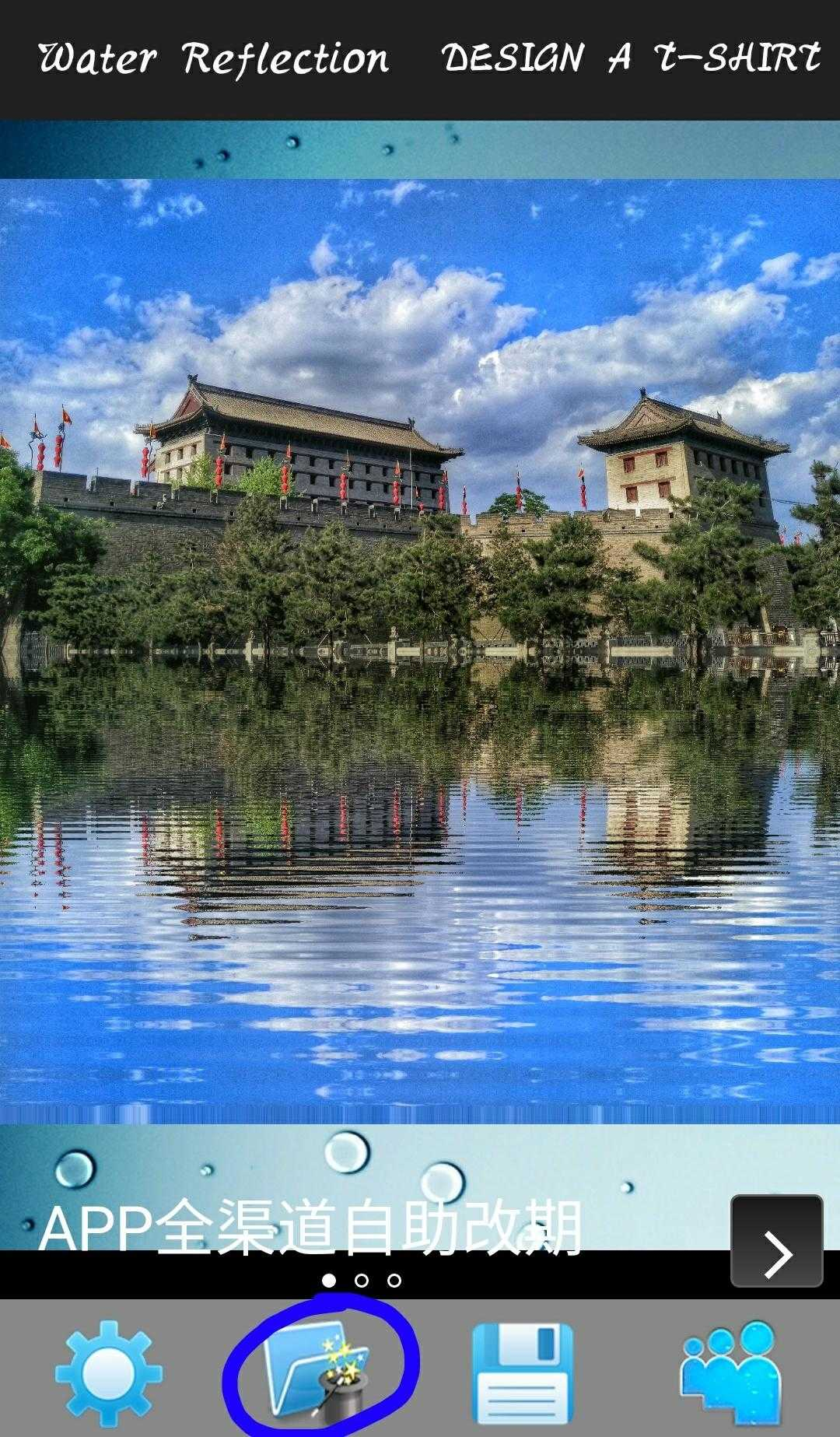 可以看到城墙的倒影效果直接出来,左右滑动选择效果强度,就这么快的一键操作啊!这款软件不希望过多的后期编辑,个人建议倒影出来后最多加个滤镜,过多的操作只会破坏该软件的实际效果,所以只专注倒影效果,谨慎使用其他修饰功能。点击下面图标开始编辑,