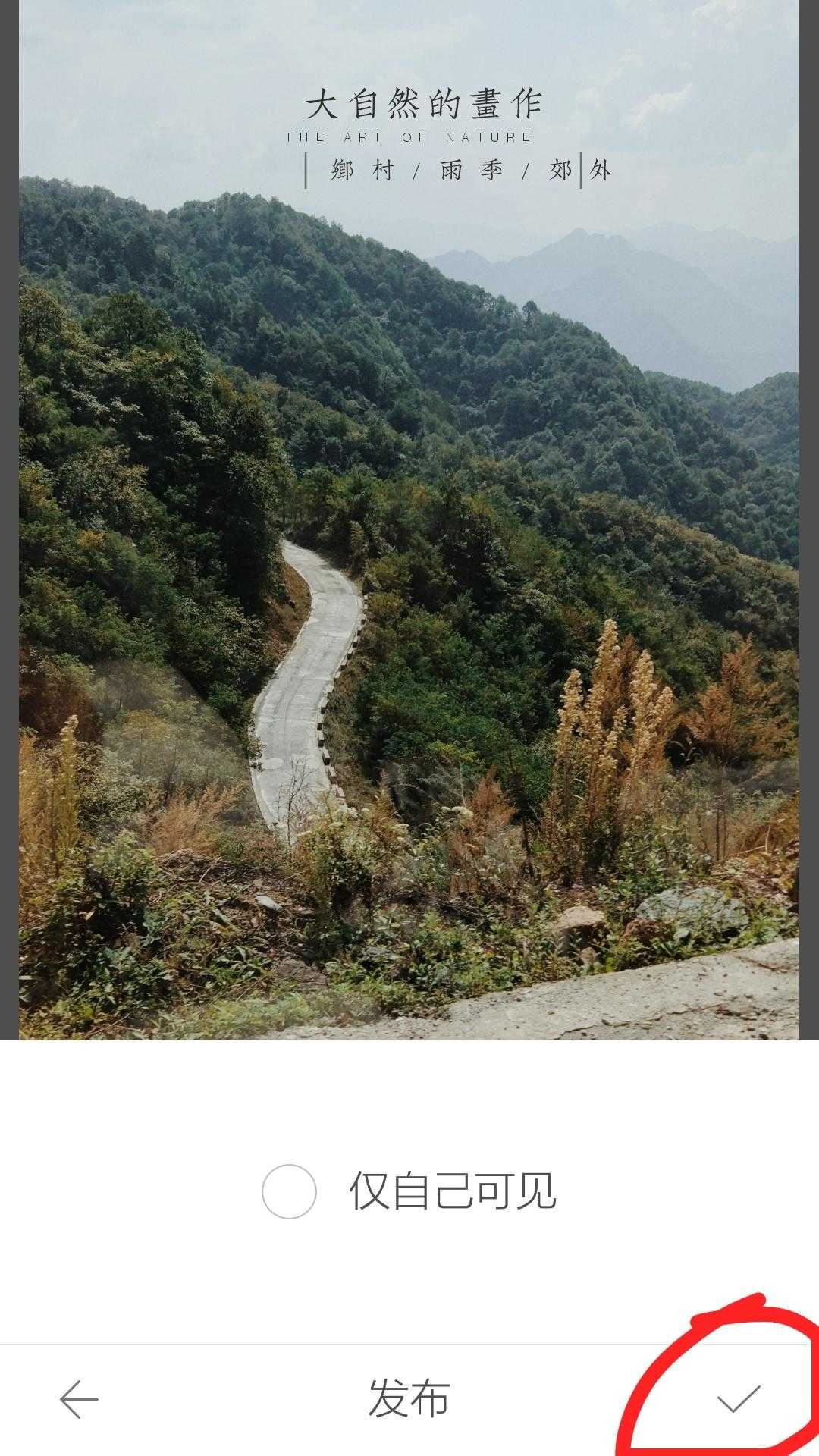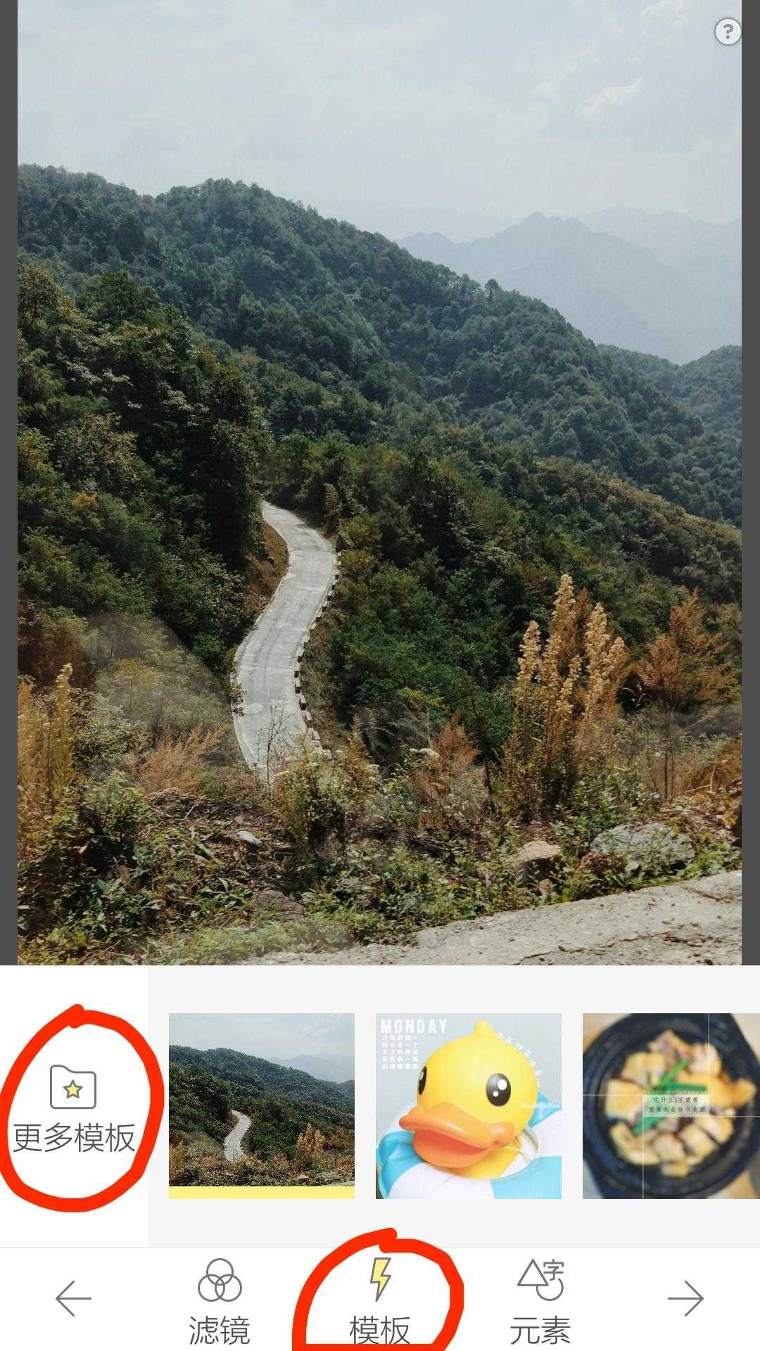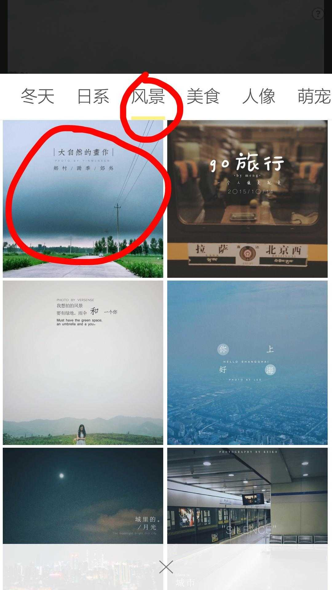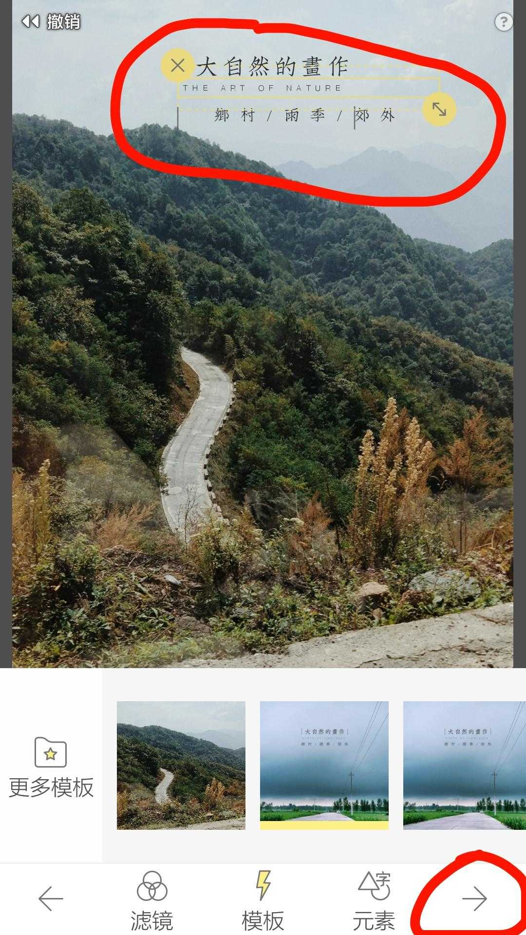 由于照片是风景照,且照片上方天空部分简洁,适合加入文字,因此在风景模板里选择第一个模版比较合适,