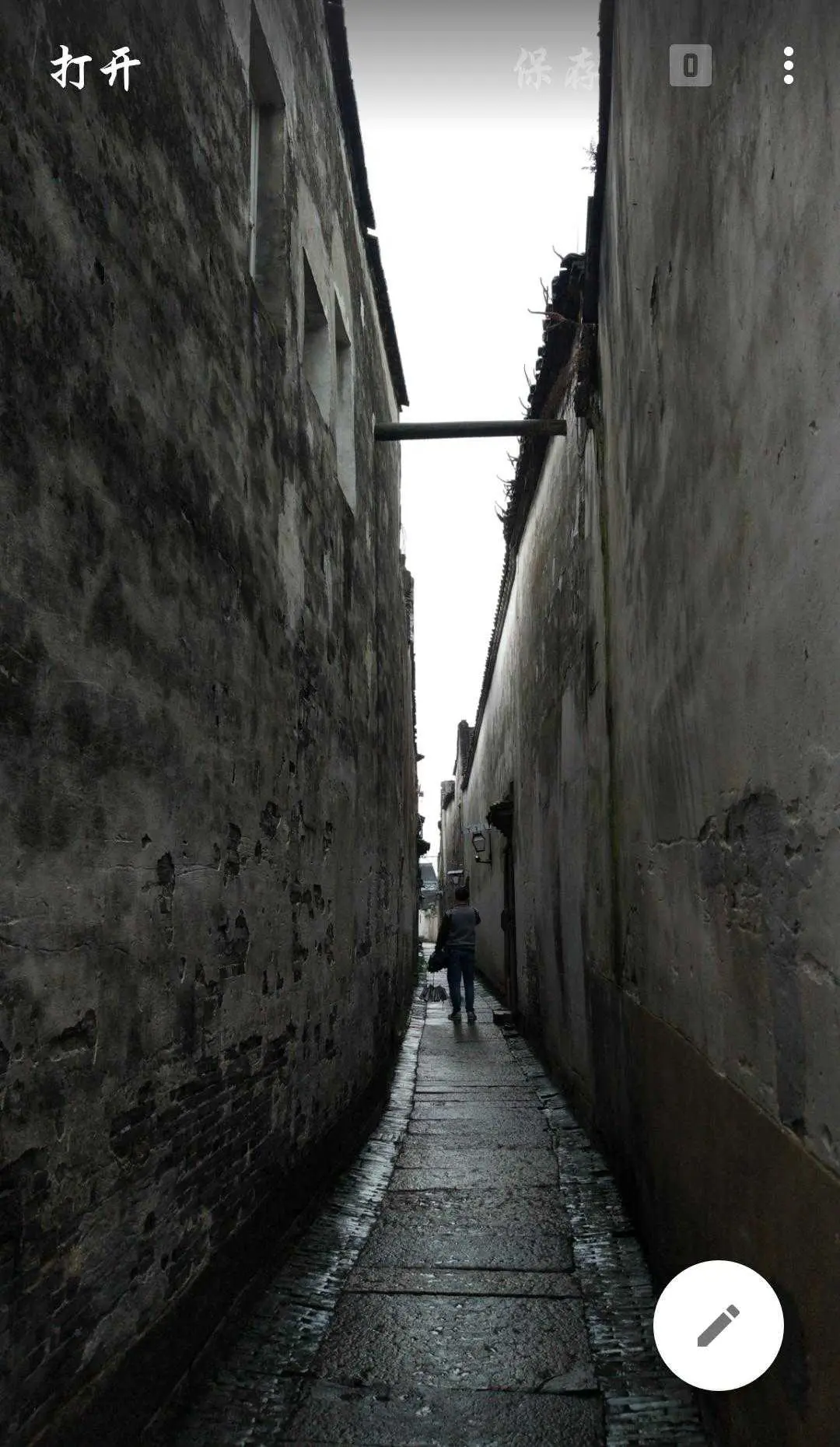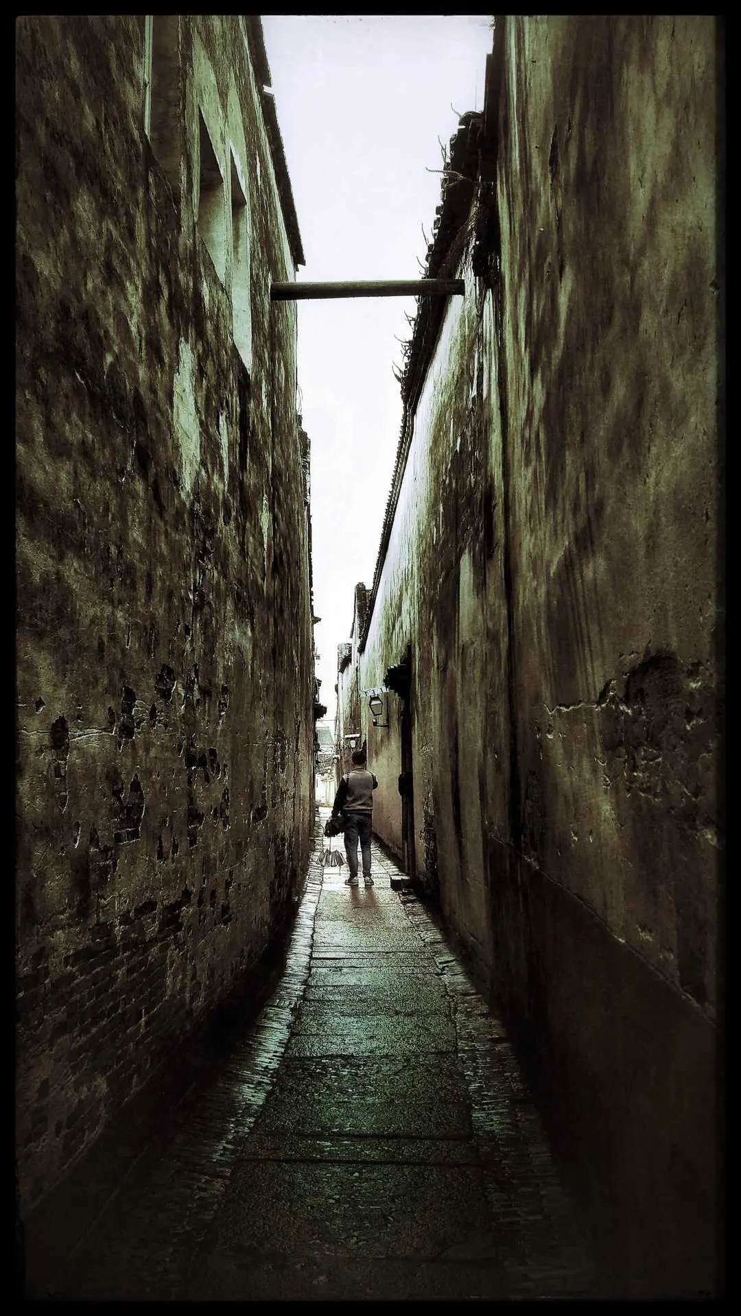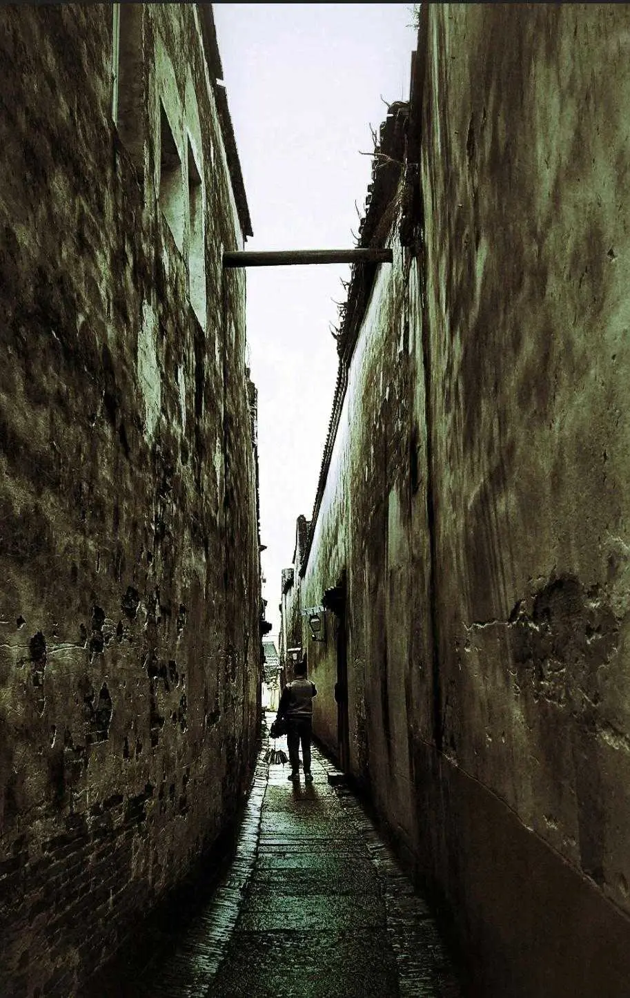 这张照片是在乌镇一个小巷子拍的,拍时主要在于手机器材的局限,只是将构图作为前期主要拍摄原因,但我知道这样的照片后期可以出大片,所以及时的按下了快门,这张照片两面是斑驳破旧的墙,中间一个人正好从通道中间走过,当时就是用两面的古旧的墙加上一个道路引导我们的视觉朝向一个行走的人,以此来表达一个孤独的人好似穿越时空的那种落寞困惑感,这里的思路是根据江南古镇特点将照片后期修成斑驳复古怀旧风格,将人物前后情况对比调整清楚,最后再修成时空错落对比强烈的照片。