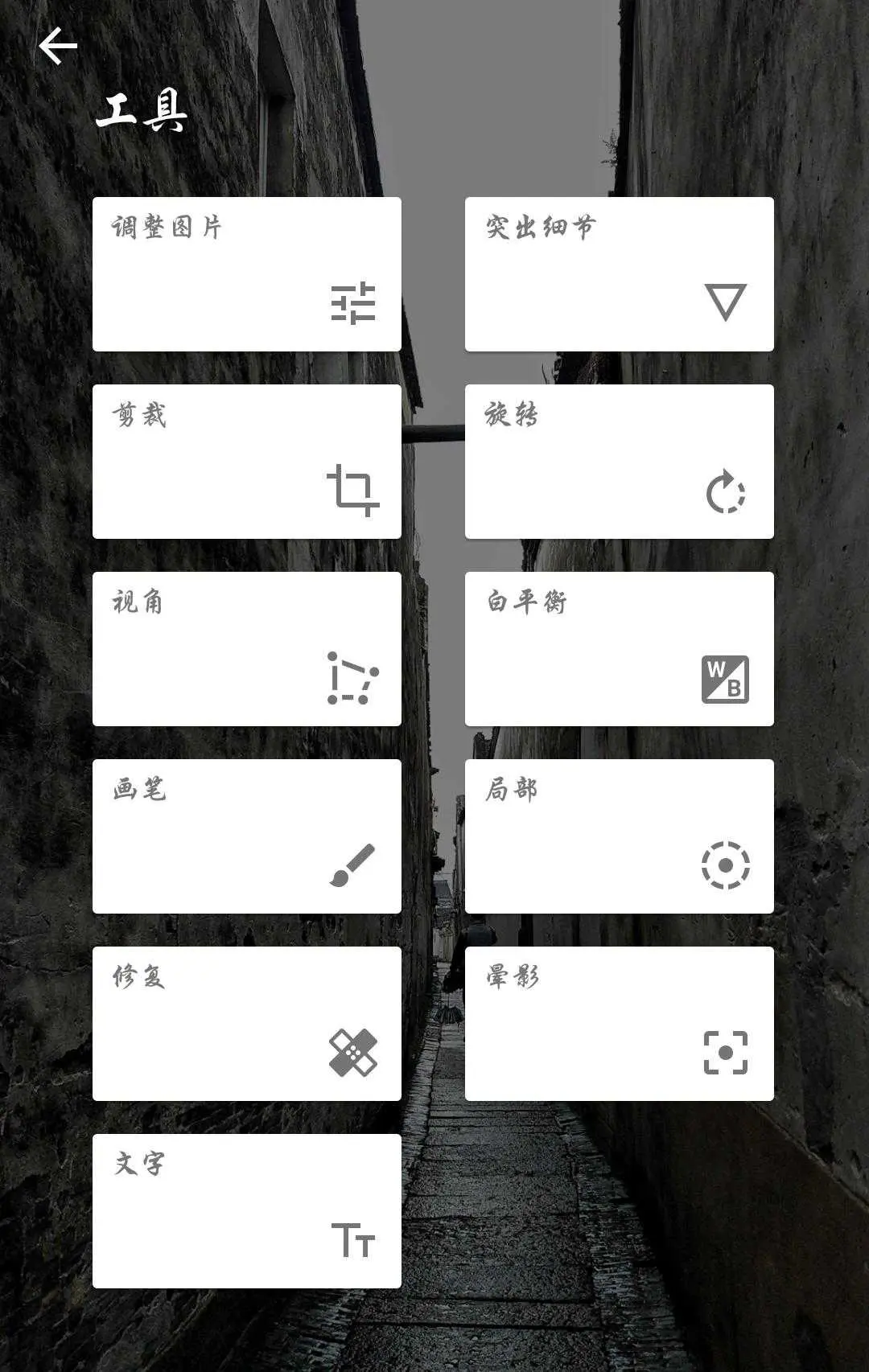 第一步,在功能区打开突出细节模块进入,手指屏幕中间上下滑动选择结构和锐化。这里的结构和锐化可以通过手指向左向右设置为-100到+100的参数,结构是增加照片中黑白对比效果,使黑白对比强烈,形成做旧的视觉冲击力,向右滑动设置为87,锐化是提升墙面黑白细节,向右滑动设为35,点击右下角对勾保存