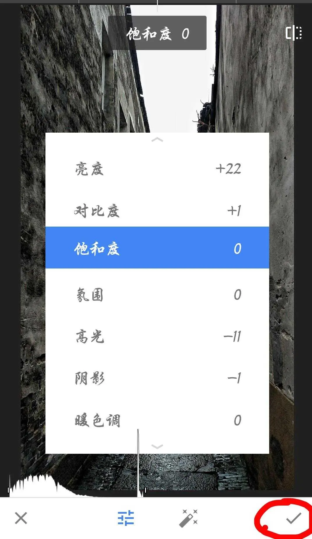 第二步,进入功能区的调整图片模块,在这里一样用手指上下滑动分别选择亮度,对比度,高光,高光,阴影,并将参数的左右滑动设置为:+22,+1,-11,-1,这里调高量亮度的目的是展示更多细节,方便后面加滤镜,增加一点对比度是对结构设置的补充,结构里已经设置过,这里不要过多增加参数,高光就是照片里面最亮的部分,这张照片最亮的部分是天空,适当调低高光亮度以引导视觉更多多注意地面和墙;阴影就是照片里面最暗的部分,这里适当降低一点,使墙上暗部稍微多点,更古朴,点击对勾保存,