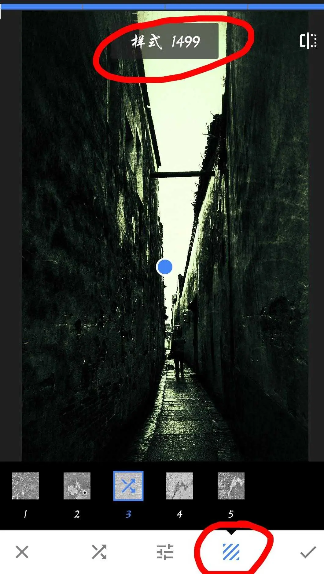 第三步,在滤镜区选择斑驳,进入斑驳滤镜功能,这个滤镜有1499种斑驳做旧滤镜,特别适合制作怀旧破旧衰败的效果。手指在屏幕左右滑动可以自由选择,向左滑动照片颜色越来越靠近黑白灰暗色彩,向右滑动照片色彩越来越呈现多姿多彩效果,下面三个图标的第三个图标可以选择斑驳做旧的程度,这里选择默认的第三种做旧程度,适当做旧就行,千万不能让照片修饰;第一个图标不建议用,纯粹鸡肋,这里不多讲,点击下面第二个图标可以选择滤镜样式,亮度,对比度饱和度,纹理强度,