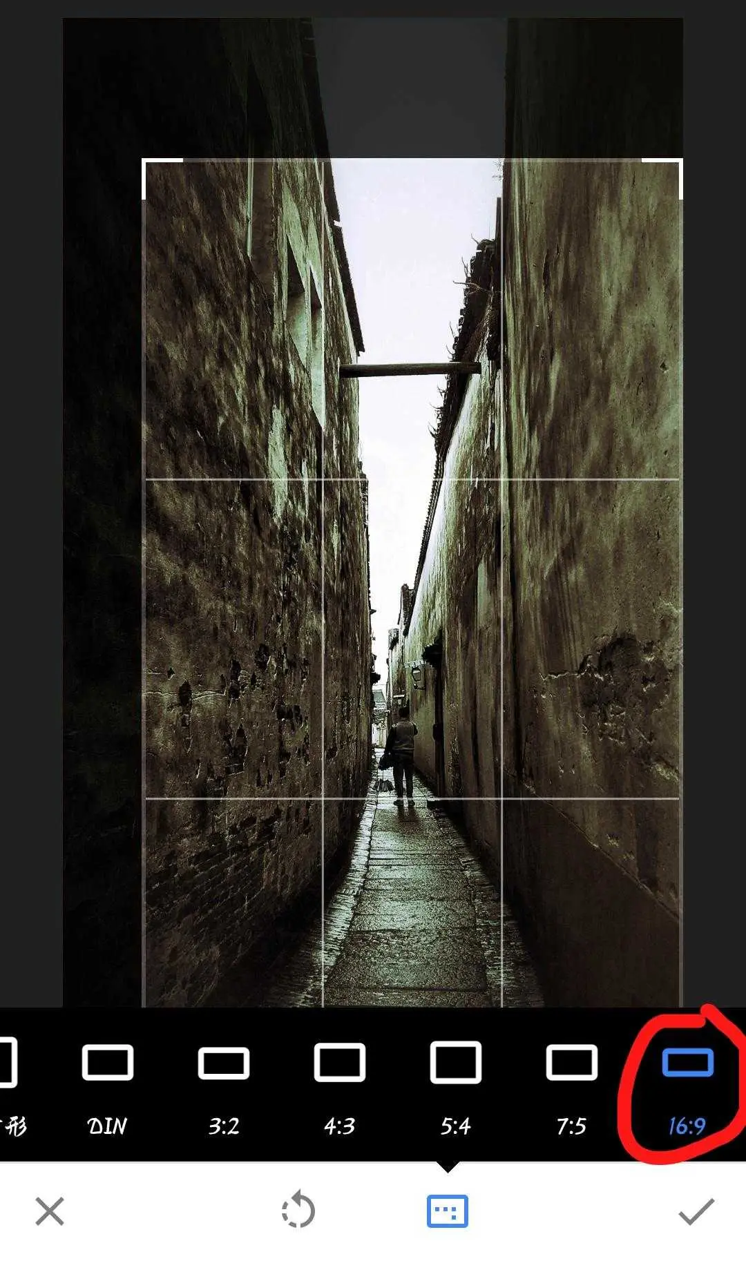 第五步,我们发现照片中的空间太大,人太小,画面太空旷,这时可以进入功能区里的裁剪模块,这里的裁剪比例有很多,包括4:3,3:2,5:4,7:5,16:9,自由裁剪等,这里选择16:9,裁剪后让照片更有空间纵深感,点击对勾保存,