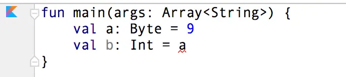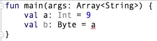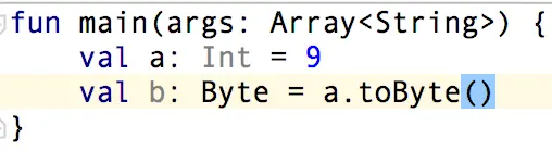 在上图中,我们看到,当我们将 Byte 类型的 a 赋值给 Int 类型的 b 时程序爆红了,那么我们该怎么解决呢?很简单:a.toInt( ),参考下图: