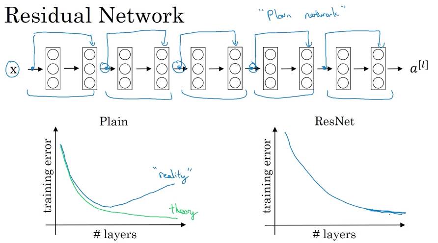 对于普通的网络来说,由于梯度下降或爆炸,训练误差并不是随着层数增加而单调递减的。这些网络具备前馈跳过连接(feed forward skipped connection),在性能不出现下降的情况下训练大型网络。