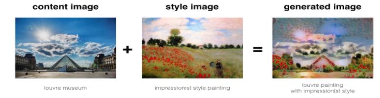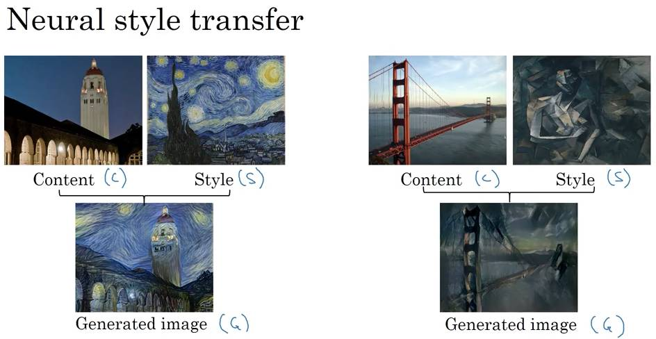 吴恩达在课程中解释了如何结合图像内容和风格生成全新图像。如下图所示: