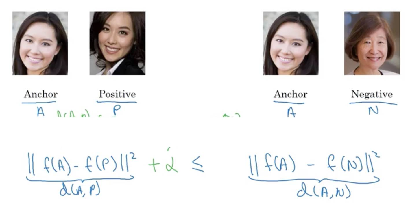 他给出的第二个解决方法是三重损失法(triplet loss method)。这个想法的核心在于图片的三个维度(Anchor(A)、Positive(P)和 Negative(N))在训练过后,A 和 P 的输出距离大大小于 A 和 N 的输出距离。