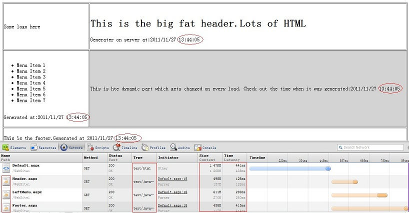 <%@ OutputCache Location=”Client” Duration=”86400” VaryByParam=”*” VaryByHeader=”*” %> 但是,浏览器上的这些缓存记录一般只能维持一天的时间。如果你有一个既有静态内容又有动态内用的页面,你则不能再页面级别使用这种输出缓存的形式。一般来讲,站点的页面、logo、左边的导航菜单和页脚都是静态部分,参考下图:
