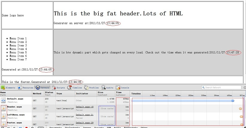 但是在第二次访问的时候,仅下载Default.aspx页面并且其他部分会立即从缓存中进行加载。下面一份图展示了加载页面不同缓存部分的实例。