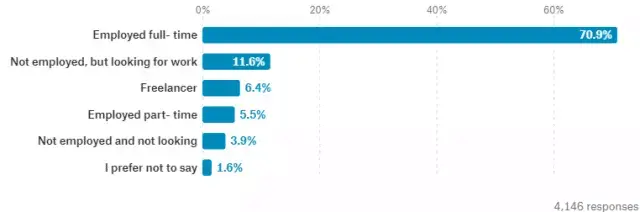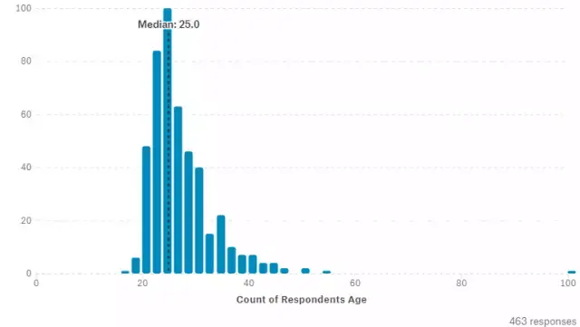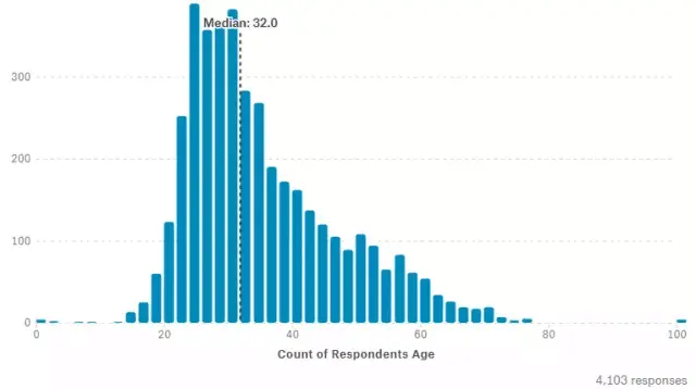 从世界范围来看,本次调查对象的平均年龄大约 30 岁,当然,这个值在各个国家之间有变动。