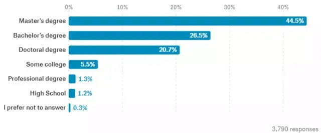 而美国,硕士学位只有44.5%,博士学位高达20.7%,本科从业者占比也高达26.5%。