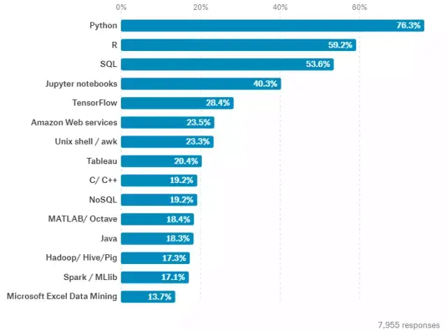 总体来说,Python是数据工作者使用最多的语言。同时,数据研究人员对R语言的忠诚度也很高。