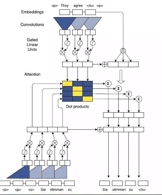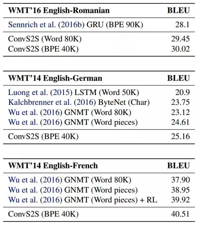 FAIR 使用门控线性单元(gated linear units,GLU)缓和了梯度传播,还在每个解码器层上都装了一个独立的注意力(attention)模块。在机器翻译比赛 WMT'14 中,FAIR 的架构的“英语-德语”和“英语-法语”翻译的准确度超过了 Wu 等人(2016) 的深度 LSTM 架构,而且在 GPU 和 CPU 上的运行速度也有数量级的提升。