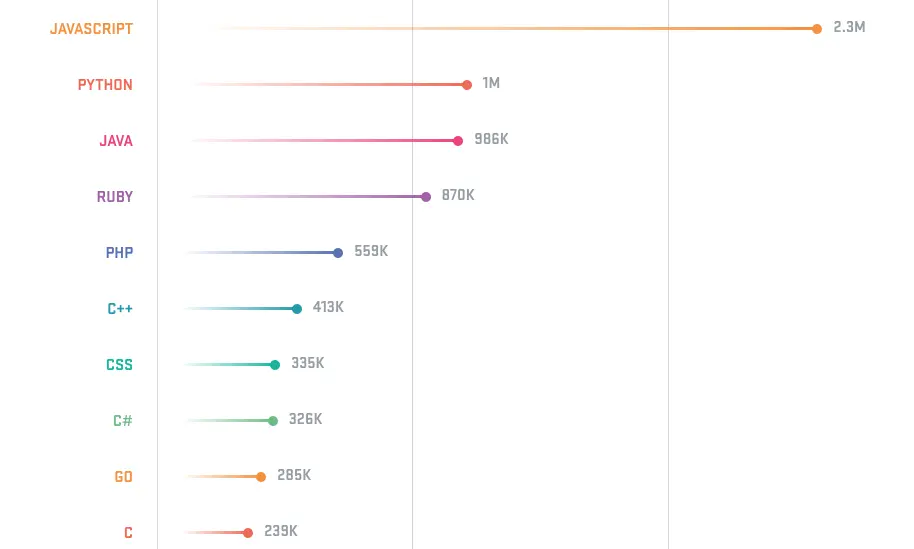 - Python取代Java成为GitHub上第二流行的语言。Python今年的拉取请求比去年增加了40%。Typescript语言在2017年也大幅增长,拉取请求大约是去年的4倍。