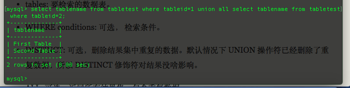 DISTINCT: 可选,删除结果集中重复的数据。默认情况下 UNION 操作符已经删除了重复数据,所以 DISTINCT 修饰符对结果没啥影响。