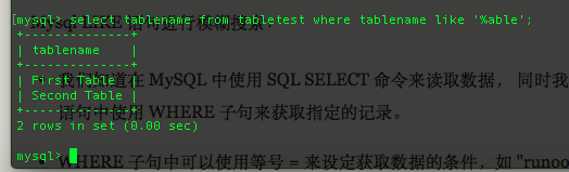 但是有时候我们需要获取tablename字段含有 "able" 字符的所有记录,这时我们就需要在 where 子句中使用 SQL like 子句。