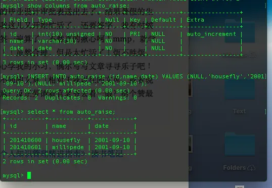 (NULL,'housefly','2001-09-10'),(NULL,'millipede','2001-09-10');在MySQL的客户端中你可以使用 SQL中的1262205 函数来获取最后的插入表中的自增列的值。