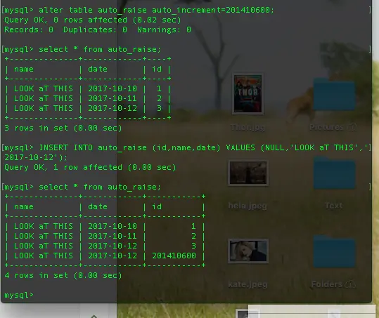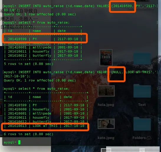 这个估计是用来手动插入的吧?果然,亲测手动插入会自导致自增起点变化,也就是说你完全可以在创建了自增之后,先插入一个想要的起点,然后再继续进行自增达到指定自增起点的目的,与上面说到的创建table的时候的手段差不多。