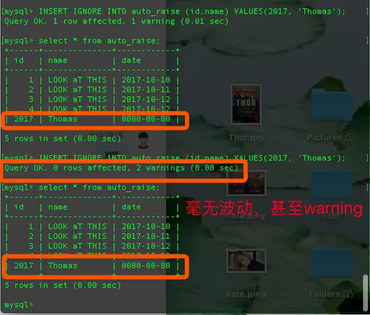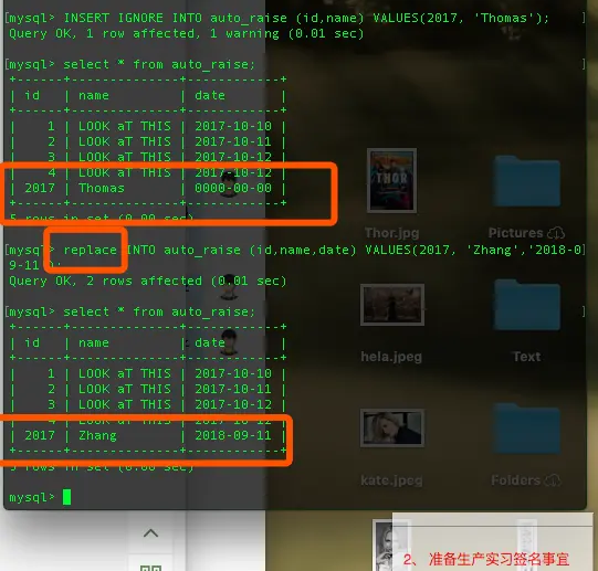 INSERT IGNORE INTO auto_raise (id,name) VALUES(2017, 'Thomas');还有一种是设置为 replace ,顾名思义,ignore是忽视本次插入,replace很明显是覆盖原本的重复的数据: