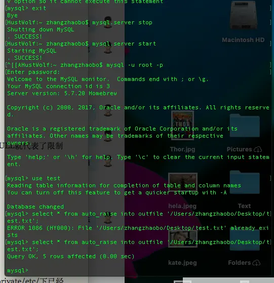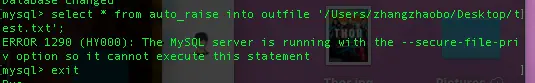 select * from auto_raise into outfile '/Users/zhangzhaobo/Desktop/test.txt';当然,不出意外,你会有这个问题: