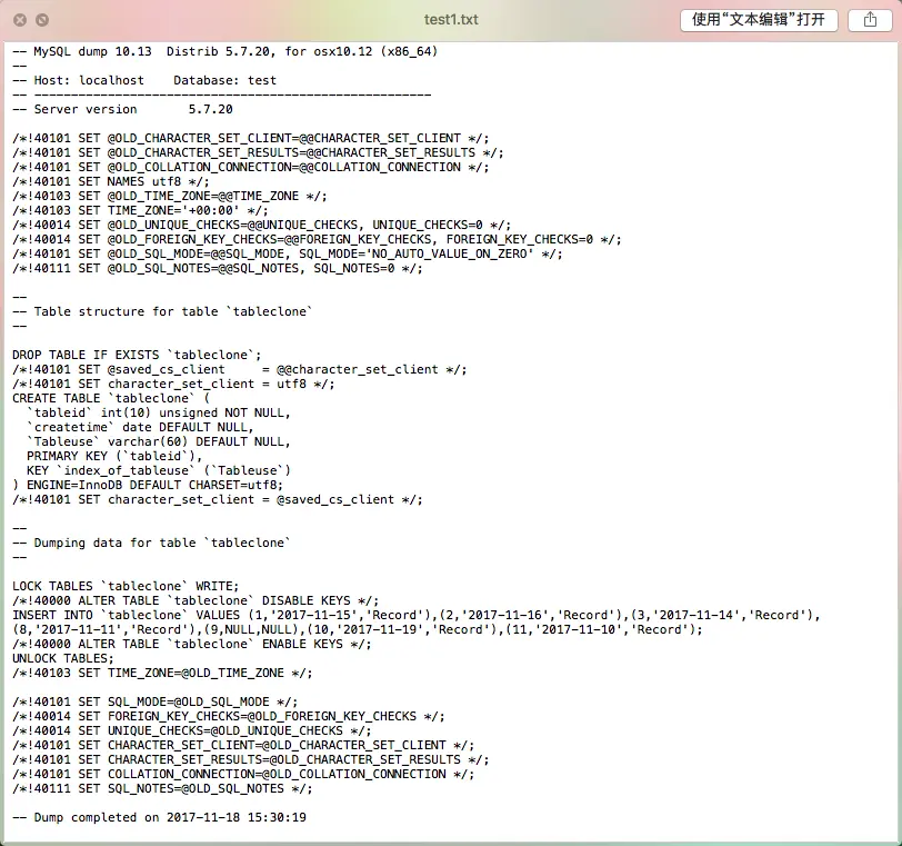 $ mysqldump -u root -p RUNOOB > database_dump.txt