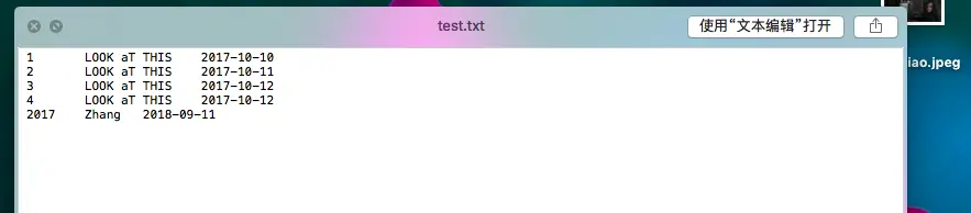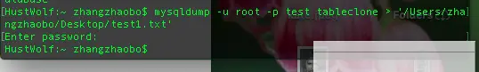 HustWolf:~ zhangzhaobo$ mysqlimport -u root -p --local test '/Users/zhangzhaobo/Desktop/test1.txt'