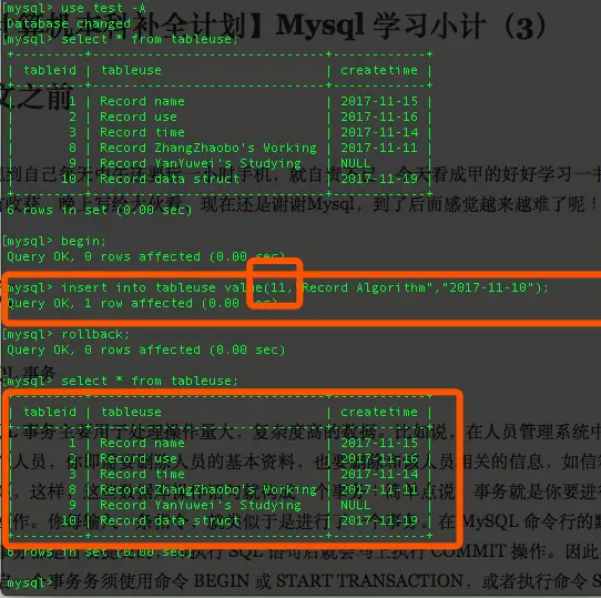 Mysql 事务主要用于处理操作量大,复杂度高的数据。比如说,在人员管理系统中,你删除一个人员,你即需要删除人员的基本资料,也要删除和该人员相关的信息,如信箱,文章等等,这样,这些数据库操作语句就构成一个事务!简单点说,事务就是你要进行的一系列操作。你每输入一条指令,就类似于是进行了一个事务。在 ### Mysql 命令行的默认设置下,事务都是自动提交的,即执行 SQL 语句后就会马上执行 COMMIT 操作。因此要显式地开启一个事务务须使用命令 begin 或 START TRANSACTION,或者执行命令 set AUTOCOMMIT=0,用来禁止使用当前会话的自动提交。