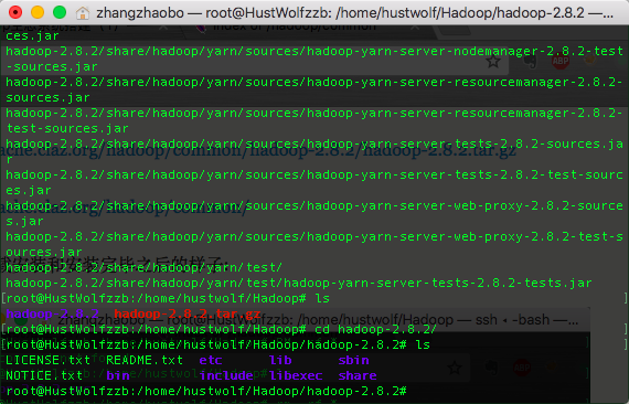 root@HustWolfzzb:/home/hustwolf/Hadoop/hadoop-2.8.2# ls那么,先把所有的先关了。方法是到sbin下采用stop脚本,可以直接stop-all.sh 也可以试试stop-dfs.sh stop-yarn.sh 两个搭配。然后再开启一次就ok.