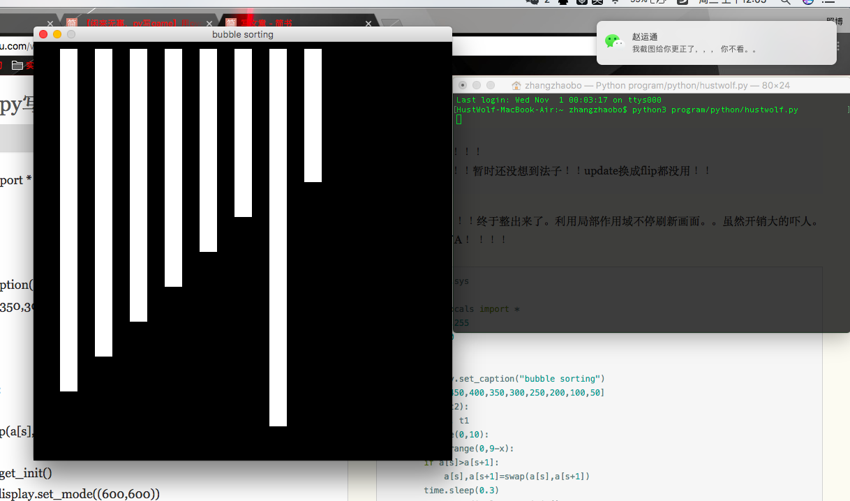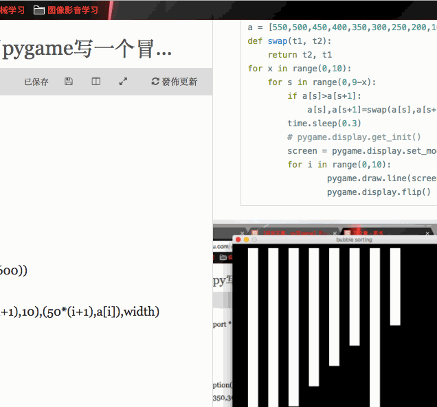 pygame.display.flip()最后再在最外层补上一段代码就可以了。这样最后就会停留在排序好厚的画面中!!