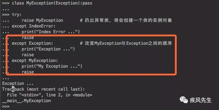 抛出的异常类是except定义的异常类的子类或本类,其他在except定义的异常类将不捕获异常