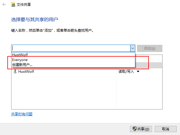 然后会让你选择与其共享的用户,你可以选择只对你的电脑用户开放,那么你就需要在另外一台电脑上登陆,或者你也可以设置,创建一个新用户,然后用新用户在另一台电脑下登陆。我是选择的任何人都可以访问,因为在这个路由器下都是熟人,甚至可能现在就只有我。另外,如果你想构建全班的电影资源库的话,那么我是建议直接全部人,反正在这个文件夹下大家都能操作,但是出了这个文件夹就没有办法了。所以电脑的安全应该是不用管的。