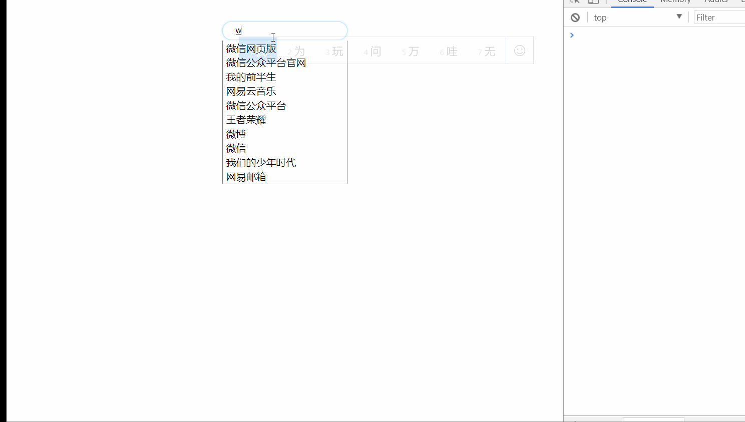 在这个例子中,需要实现一个就是,当有下拉热词出现的时候,其实是包裹来一个ul内部的,而这些填充的很多的li,每一个li都需要绑定一个click事件,用来干什么呢?当点击其中一个li的时候,需要将这个li的内容填充到搜索输入框。
