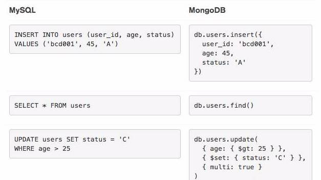 MySQL和MongoDB都有丰富的查询语言。在MongoDB文档https://docs.mongodb.com/manual/reference/sql-comparison/?_ga=2.97293983.1414641971.1500188964-1583439788.1500188964 中可以找到一个完整的语句列表。
