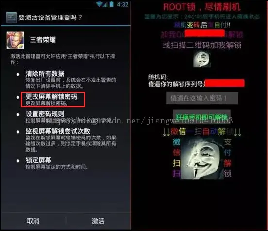 大部分都是采用了系统的设备管理器来获取权限进而修改密码,然后提示你需要重启设备才能有效,这样的样本通过特殊的应用名称和图标来诱导用户下载安装授权,一般小白用户为了玩农药,什么都不管了,直接从网上搜一个安装就开始操作了,结果被自己坑了,所以下载软件一定要去正规的应用市场去。别乱下载应用,而这样的锁机样本一般都是会选择加固,不过可惜他们为了节约成本都是用了非企业版的免费版加固,脱壳就比较简单了,然后逆向分析代码就可以找到他设置的锁机密码,然后解密即可。