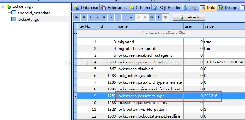 上面就利用root权限修改了用户的锁机密码,但是这里有一个问题,就是现在很多设备已经支持指纹锁了,而且指纹锁未来也是趋势,那么如果一个设备用了指纹锁,该怎么办?对于上面利用设备管理器权限就没法操作了。但是对于root权限我们仍然可以操作,我们在分析了锁机密码加密过程中发现,系统会把当前锁机类型值保存到数据库中: