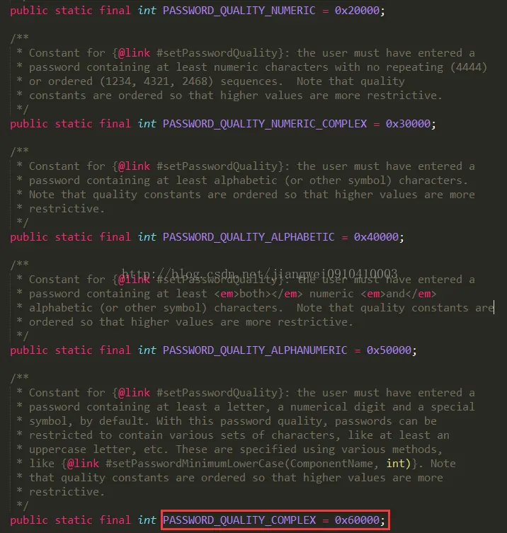就是复杂的字符密码类型,当然还有其他类型,这个定义在DevicePolicyManager.java类中。那么到这里我们就有思路了,如果设备的类型是指纹锁,那么我们可以修改这个表格数据中的这个字段将其变成手势密码或者是字符密码类型,然后在将修改后的这两种类型密码写入到key文件,重启设备就就可以过滤了指纹锁密码了。因为我们有了root权限,读写这个数据库文件不难了,而具体实现代码这里就给了,感兴趣的同学可以尝试操作一下。
