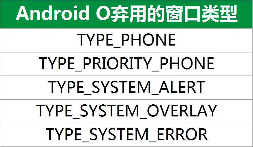 而对于窗口样式锁机最为常见,就是利用WindowManager设置最高权限,导致设备点击任何地方没有反应,而在Android O中已经对这个窗口权限做了严重限制:Android O预览版一经发布就给了勒索软件致命打击,新系统禁用了5种窗口。如下图所示,其中包括3种勒索软件常用的系统窗口类型,窗口置顶类勒索木马“赖以生存”的系统窗口类型被限制使用了。