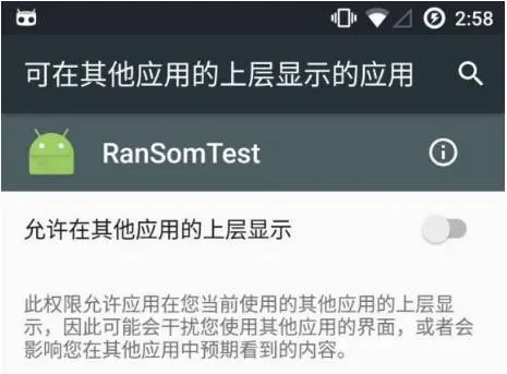 自Android 6.0起至Android 7.1,Android系统开启动态权限模型,SYSTEM_ALERT_WINDOW权限开始被列为一项特殊权,尽管其权限级别(Signature)不是Dangerous,但开发者在使用之前也必须动态获得用户授权,只有在用户进行授权后,应用才可以随意使用TYPE_SYSTEM_ALERT、TYPE_SYSTEM_OVERLAY、TYPE_SYSTEM_ERROR等高级别窗口。在这一阶段,用户通过一项Action——MANAGE_OVERLAY_PERMISSION打开设置“在其他应用的上层显示”页面,如下图所示,用户手动允许后,系统高级别窗口权限开放,此时即可成功使用这些窗口进行手机勒索。
