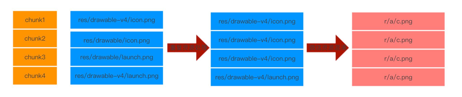 微信资源混淆的目标路径映射规则是根据id值映射的,不是根据原始路径。因此我们需要改变默认的映射规则,如果原始路径相同,则映射到相同的目标路径,并且不做后续的copy工作。修改了映射逻辑后,资源3最终映射的路径也变为了r/a/c.png。