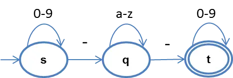 例子中,绿色的代表正常流量,红色的代表异常流量。由于异常流量和正常流量在参数、取值长度、字符分布上都很相似,基于上述特征统计的方式难以识别。进一步看,正常流量尽管每个都不相同,但有共同的模式,而异常流量并不符合。在这个例子中,符合取值的样本模式为:数字 _ 字母 _ 数字,我们可以用一个状态机来表达合法的取值范围: