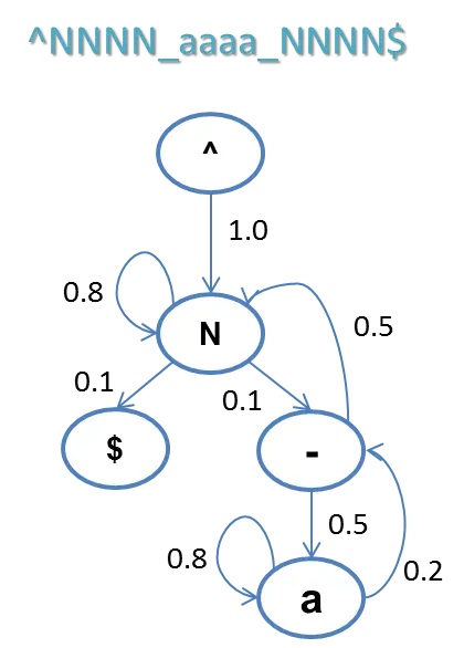 紧接着,对于每个状态,统计之后一个状态的概率分布。例如,下图就是一个可能得到的结果。“^”代表开始符号,由于白样本中都是数字开头,起始符号(状态^)转移到数字(状态N)的概率是1;接下来,数字(状态N)的下一个状态,有0.8的概率还是数字(状态N),有0.1的概率转移到下划线,有0.1的概率转移到结束符(状态$),以此类推。