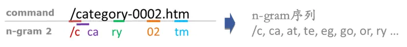 首先通过长度为N的滑动窗口将文本分割为N-Gram序列,例子中,N取2,窗口滑动步长为1,可以得到如下N-Gram序列。