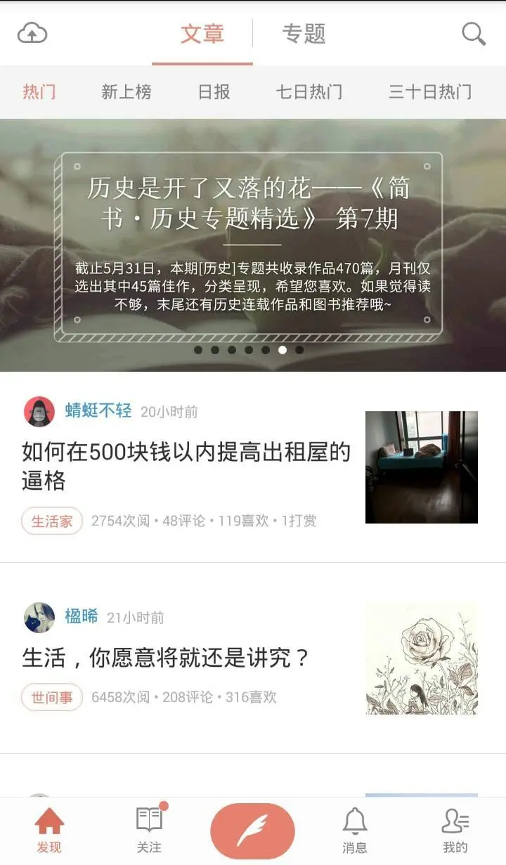 简书的版面设计比较简洁,看起来非常的舒服。最重要的是设计的个性化,每个人打开网站所看到的内容都是不一样,给你私人订制般的享受。