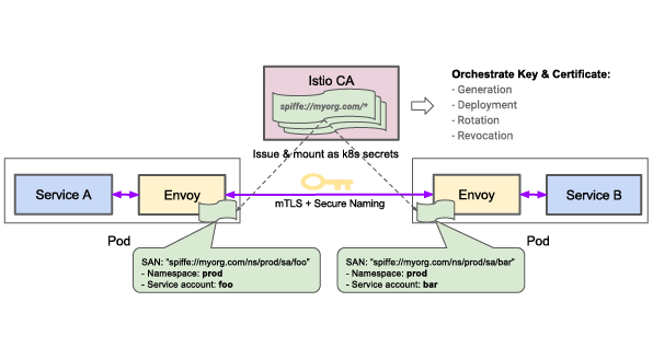 在这个例子中, 服务A以服务帐户“foo”运行, 服务B以服务帐户“bar”运行, 他们之间的通讯原来是没有加密的. 但是Istio在不修改代码的情况, 依托Envoy形成的服务网格, 直接在客户端Envoy和服务器端Envoy之间进行通讯加密。