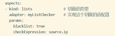定义切面, 使用前面定义的 myListChecker 这个adapter 对属性 source.ip 进行黑名单检查。