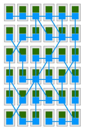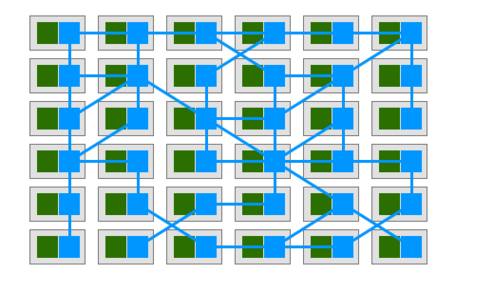 在上图中绿色方块为服务,蓝色方块为边车部署的服务网格,蓝色线条为服务间通讯。可以看到蓝色的方块和线条组成了整个网格,我们将这个图片旋转90°,就更加明显了:服务网格呈现出一个完整的支撑态势,将所有的服务”架”在网格之上: