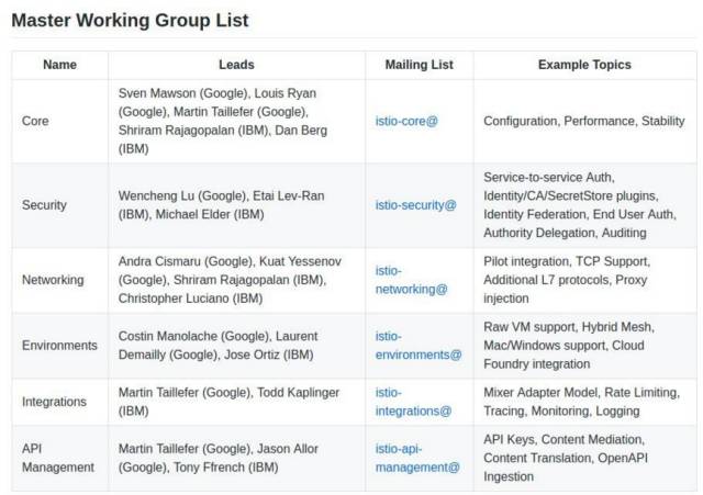 Google和IBM相信不需要介绍了, 在Istio项目中这两个公司是绝对主力,举个例子,下图是 Istio Working Group的成员列表: