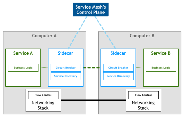 为了帮助理解, 下图展示了服务网格的典型边车部署方式: