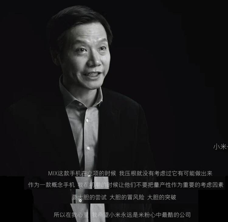 「MIX 这款手机在立项的时候,我压根就没考虑过它又可能做出来,作为一款概念手机,我在初期的时候让他们不要把量产性作为重要的考虑因素,要大胆的尝试,大胆的冒风险,大胆的突破,所以在我心里,我希望小米永远是米粉心目中最酷的公司。」