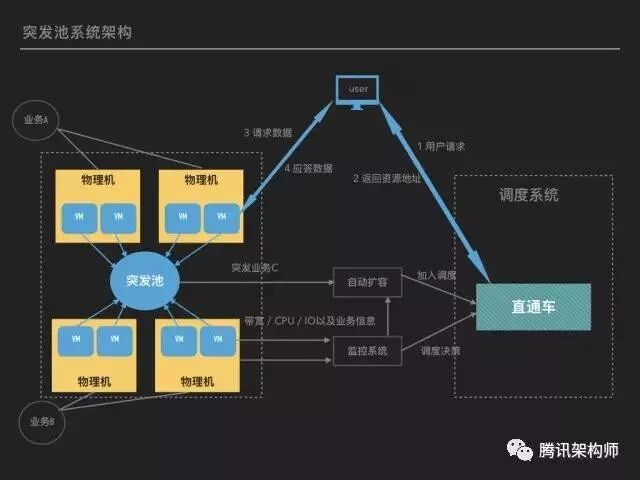 ☉ 突发池:在各平台物理机的上层,由 Docker 虚拟机组成的资源池,对 CPU/内存/磁盘等使用进行了限制,防止对物理机造成影响。原有业务依然部署在物理机上,不用调整。 ☉ 自动化部署和监控系统: 能根据业务实际需求,自动预测需求并扩容 。所有的突发需求,都能在 10 分钟内扩容完成。针对点播/下载业务,自动分发热点文件,降低回源带宽。 ☉ 调度系统:突发业务的突发性和体量大两个特点,使得相比域名调度系统,直通车更占优势。直通车调度更灵活,生效时间快,能达到分钟级。虚拟机和物理机部署了上报 Agent,业务信息和服务器负载每分钟都会上报到监控系统。监控系统会根据历史带宽预测一个值,并与当前带宽比较,如果当前带宽超过预测值的 50%,则认为有突发。根据带宽上涨的比例,系统会自动从突发池中扩容相应数据的设备。针对提前准备的突发活动,运维可以指定带宽需求量,之后系统便会自动计算设备需求并扩容。